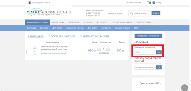 Откройте вкладку «Промокоды» и скопируйте «текст» купона на скидку в «pharmacosmetica.ru».